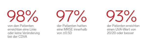 CLEAR bietet mehr als 20/20-Sehschärfe: Bereits einen Monat nach dem Eingriff erreichen 45% der Patienten eine Sehschärfe von 20/16 oder besser.1 Diese aussergewöhnlichen Ergebnisse werden durch ein hervorragendes postoperatives Aberrometrieprofil1 unterstützt und unterstreichen die präzise Leistungsfähigkeit von CLEAR, die eine potenziell schärfere und klarere Sicht ermöglicht.